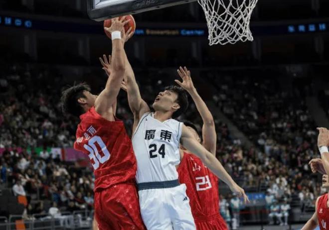第一节比赛结束,广东队以25-17领先对手8分,但是他们的三分球只有10中2的命中率。第二节比赛山东队在陶汉林和王岚嵚的带领下开始反击,陶汉林篮下强硬打成2+1,王岚嵚的三分球也有,他们打出11-2的进攻潮,将比分追至38-38平,到半场比赛结束广东队以44-40领先4分,陶汉林已经拿到了15分9个篮板,几乎以一己之力击穿了广东队的内线防守。