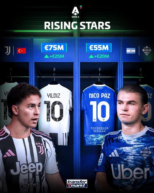 伊尔迪兹以2500万欧涨幅成为此次身价涨幅最高的意甲球员,尼科·帕斯以2000万欧位列次席。